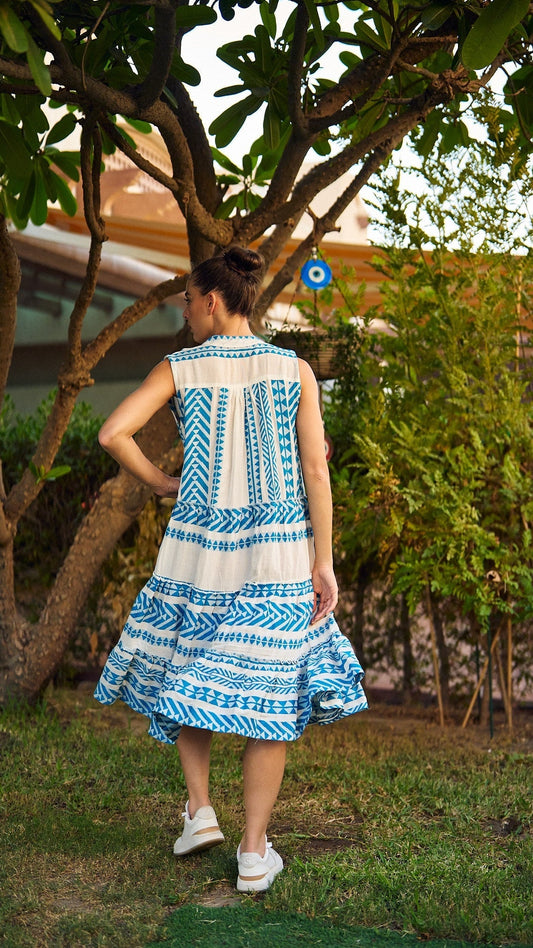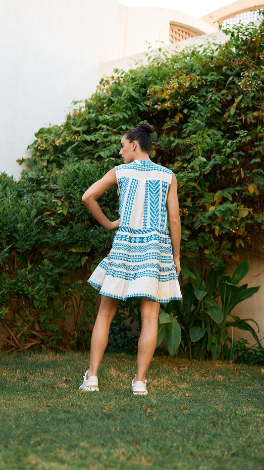 فستان صيفي قصير باللون الأزرق بدون أكمام