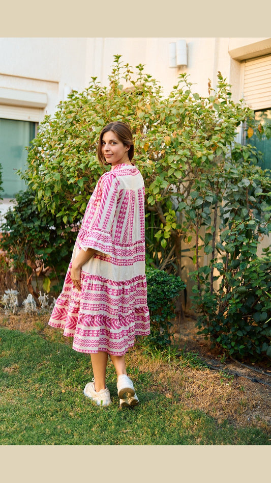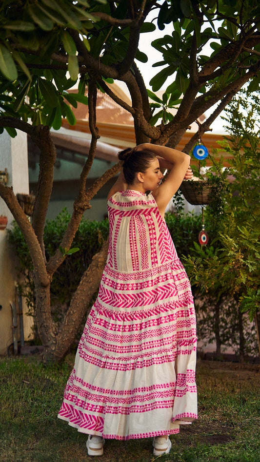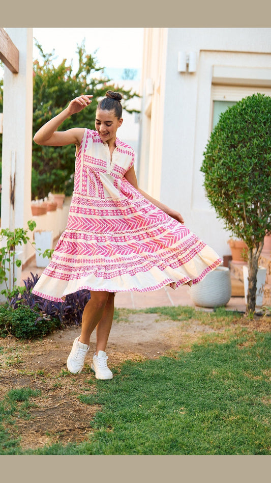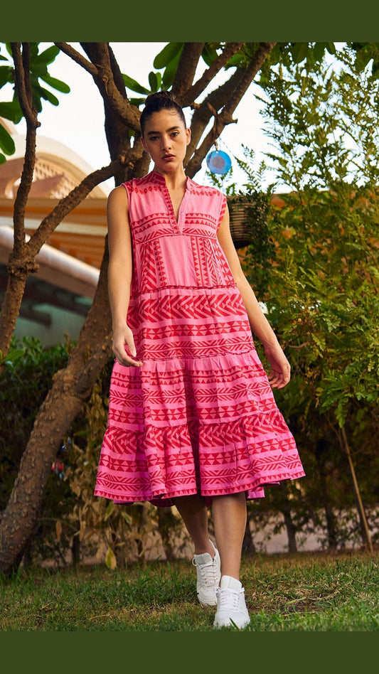 فستان صيفي بدون أكمام باللون الوردي والأحمر