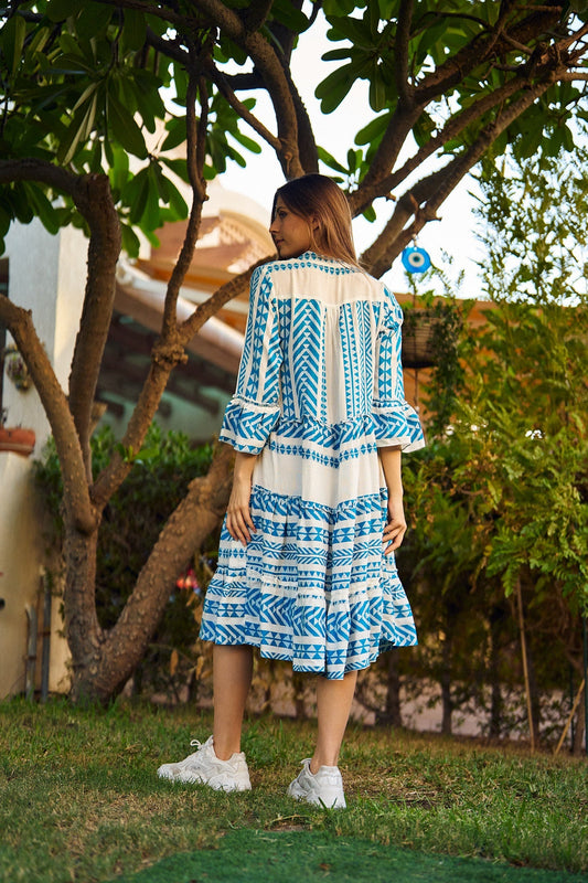 فستان صيفي متوسط الطول باللون الأزرق