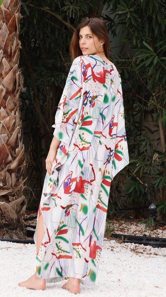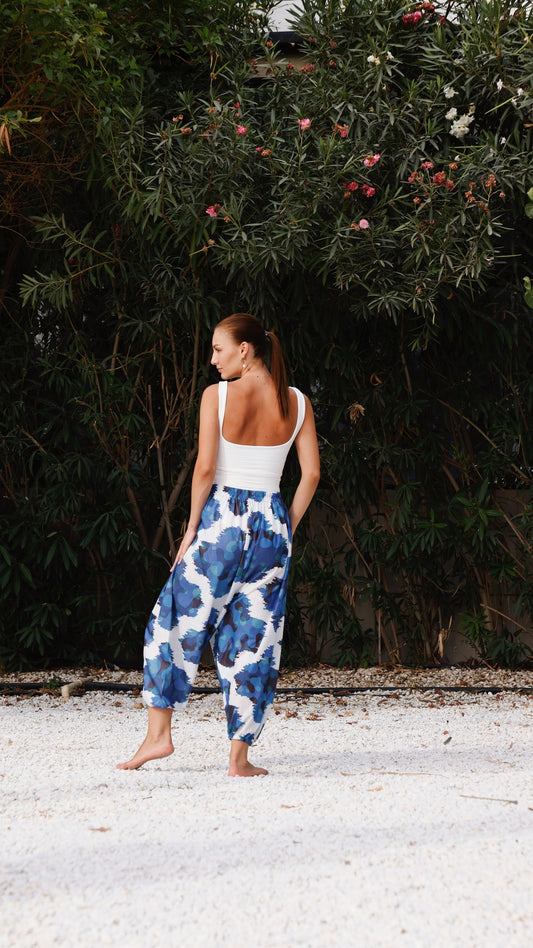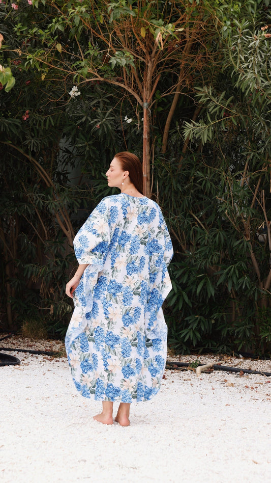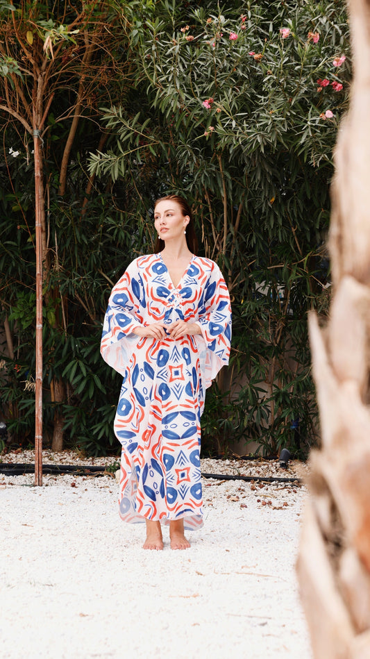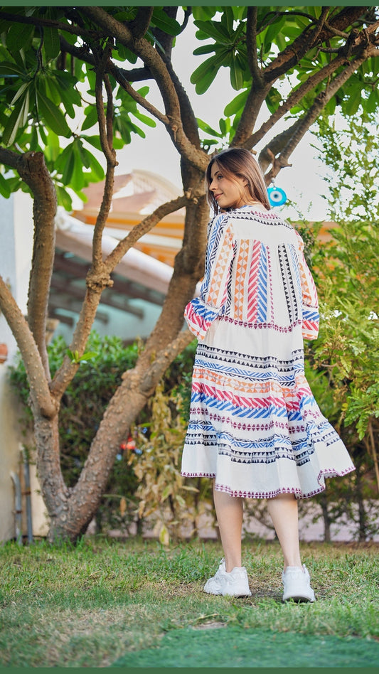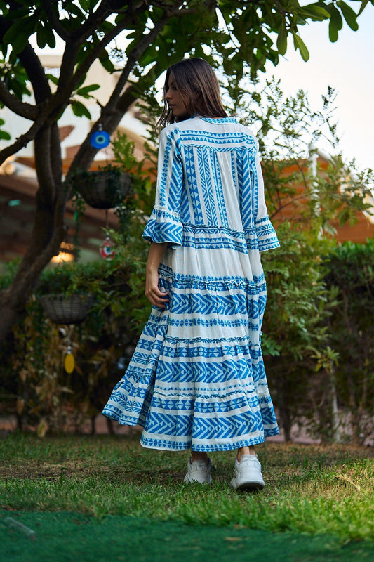 فستان أبيض وأزرق للشاطئ والمنتجع