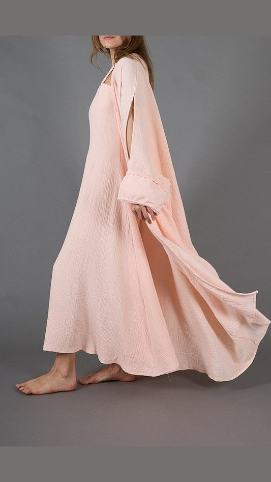 طقم قفطان من الشاش الأنيق باللون الخوخي، مكون من قطعتين، مبطن