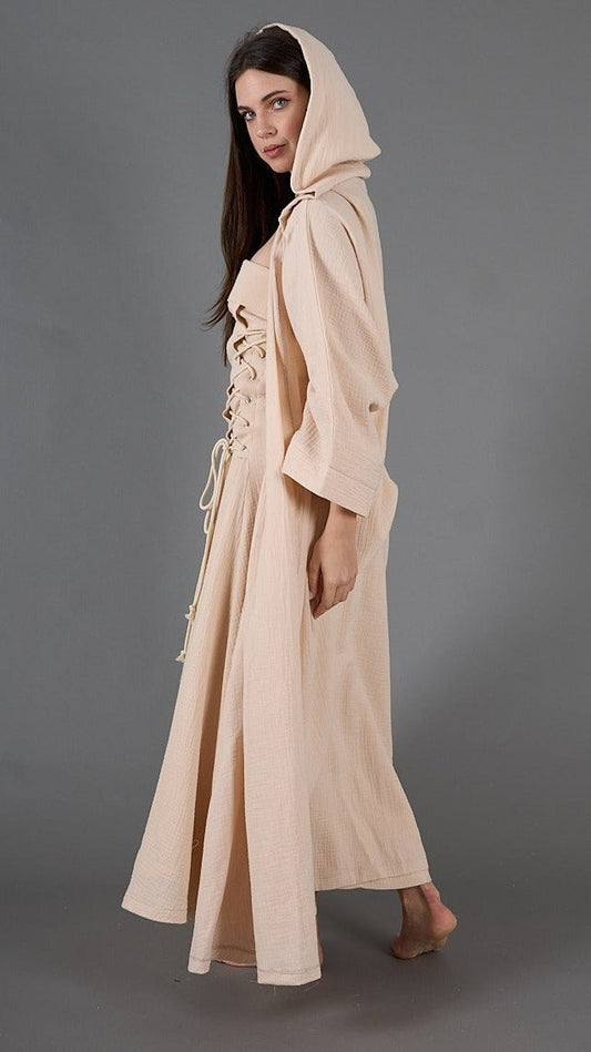 طقم قفطان من الشاش بغطاء للرأس، مكون من قطعتين باللون البيج، من أجل النعيم المنعش