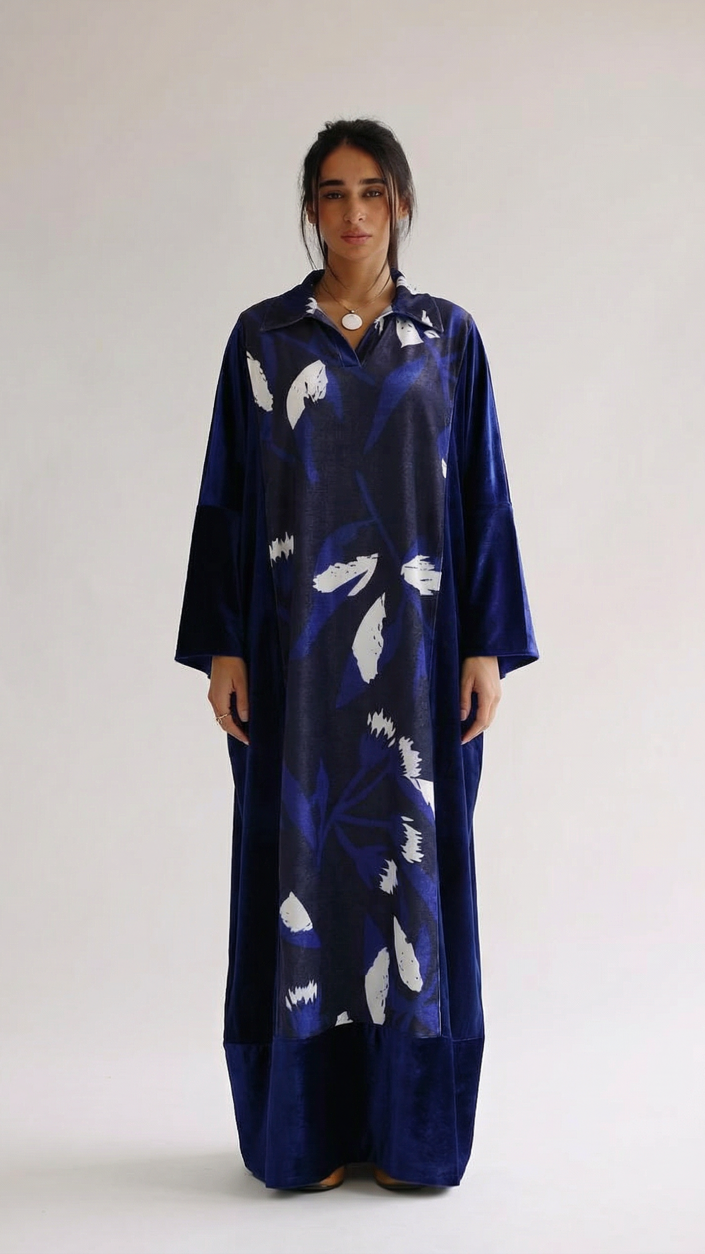 قفطان مخملي طويل باللون الكحلي قابل للتنسيق