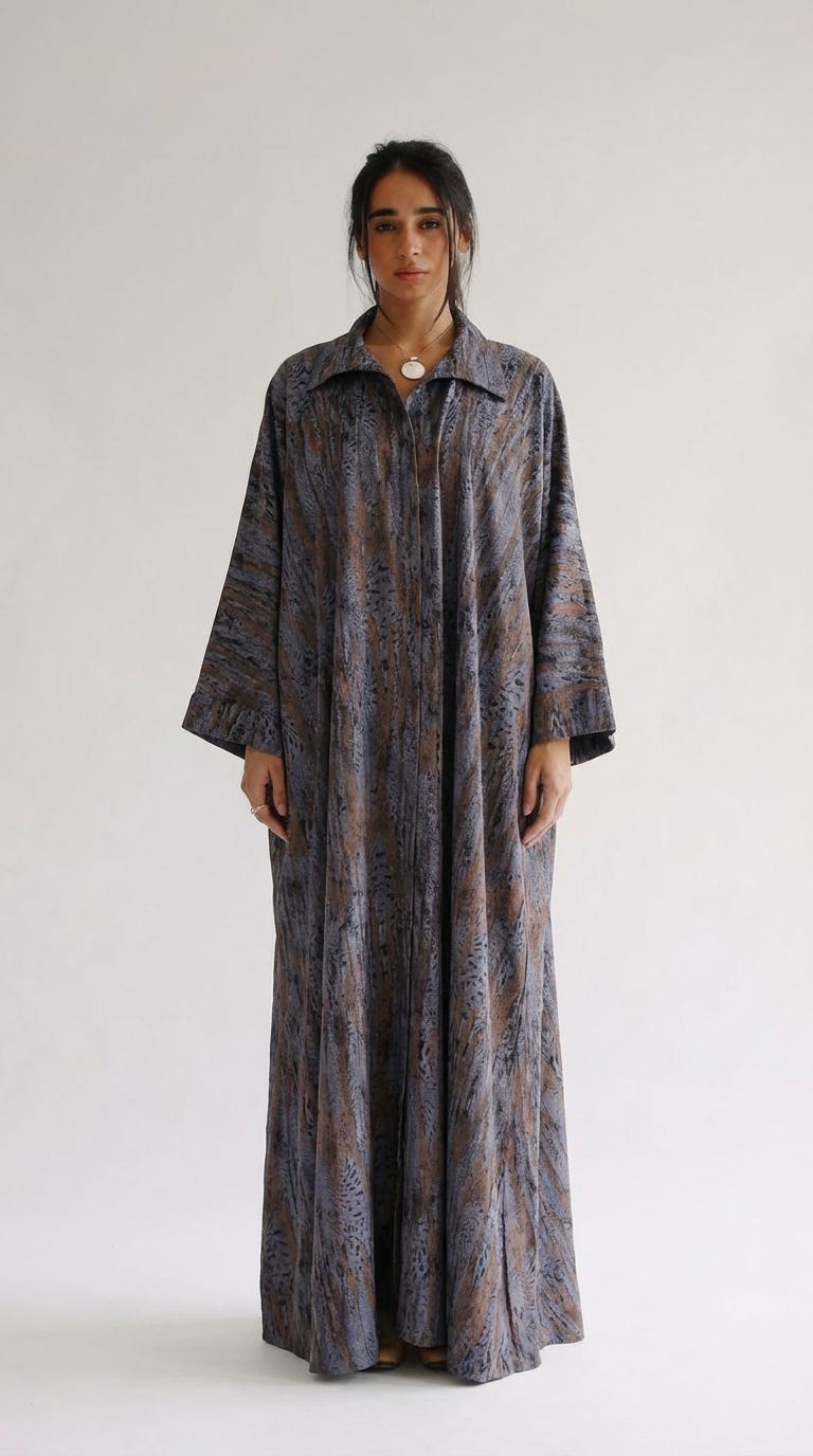 Crafted from a soft wool-viscose blend, this kaftan features a warm yet breathable feel with an elegant, fluid drape. The fabric falls naturally along the body, creating a refined silhouette that moves beautifully with every step.